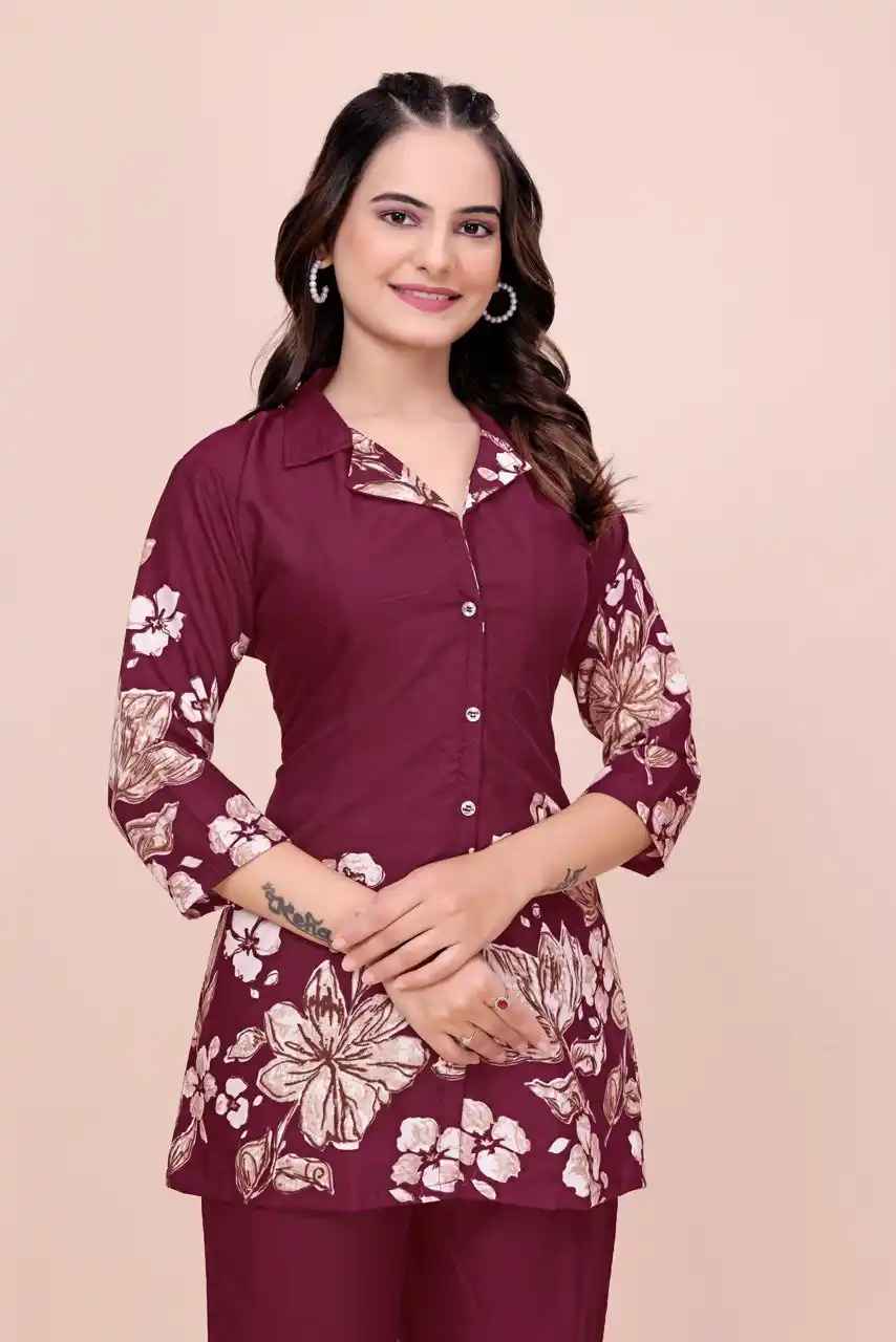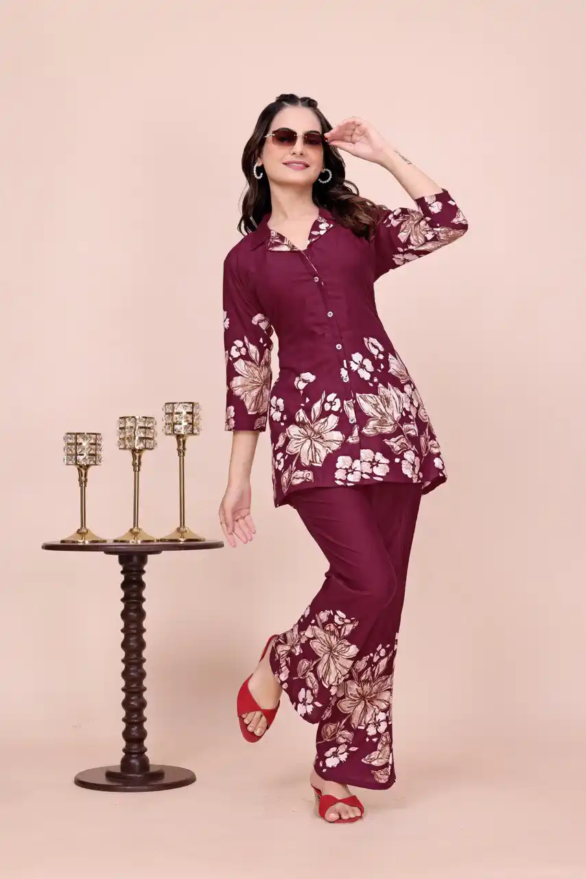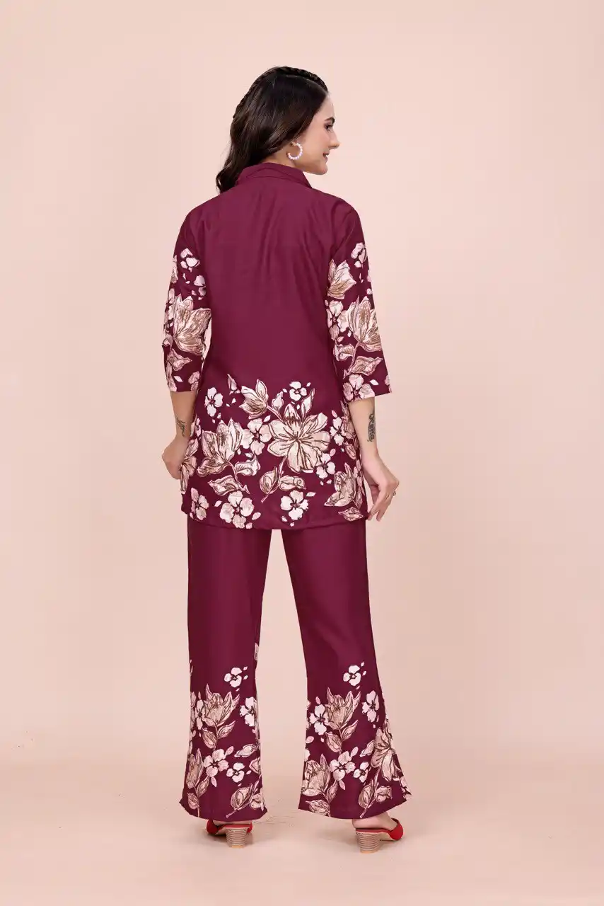 Women's Floral Print Co-ord Set, Burgundy Top and Palazzo Pants, 3/4 Sleeve